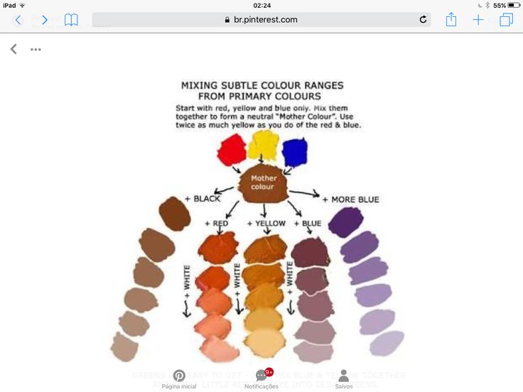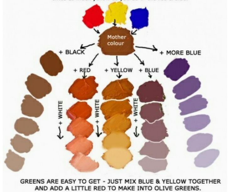 Как и в случае с оранжевым и зеленым, вы можете заменить названные выше пигменты своей собственной смесью красного или зеленого или использовать другие пигменты. Некоторые другие хорошие пигменты, которые следует учитывать для смешивания коричневого, — это саповый зеленый, фталозеленый, хинакридоновый красный и жженая сиена. Как только вы получите простой коричневый цвет, используя красный и зеленый, вы можете добавить небольшое количество любого цвета, чтобы еще больше изменить свой коричневый цвет и поэкспериментировать с созданием новых коричневых оттенков.