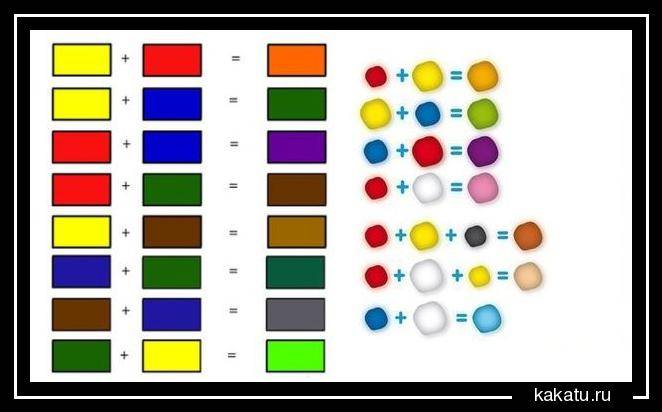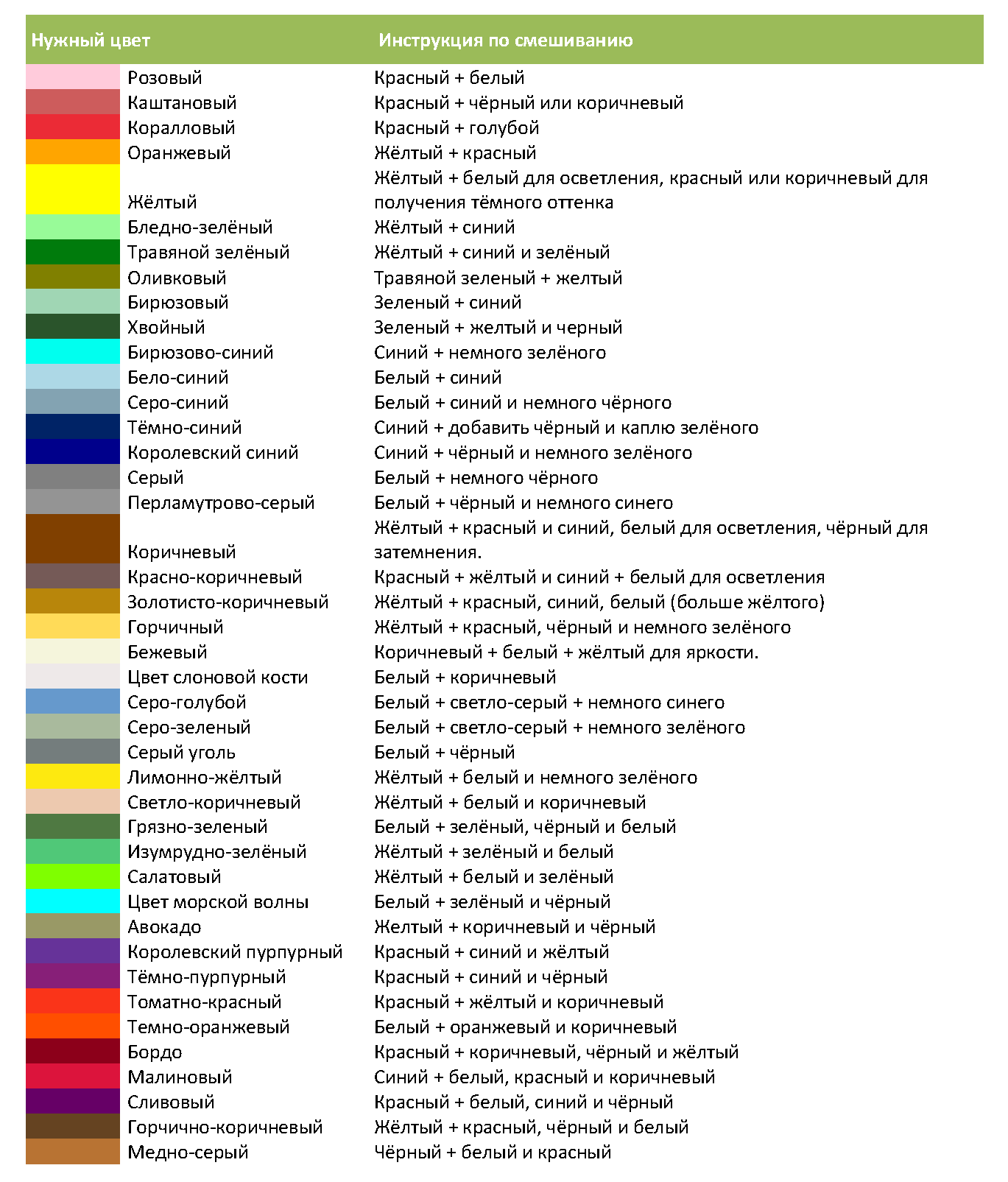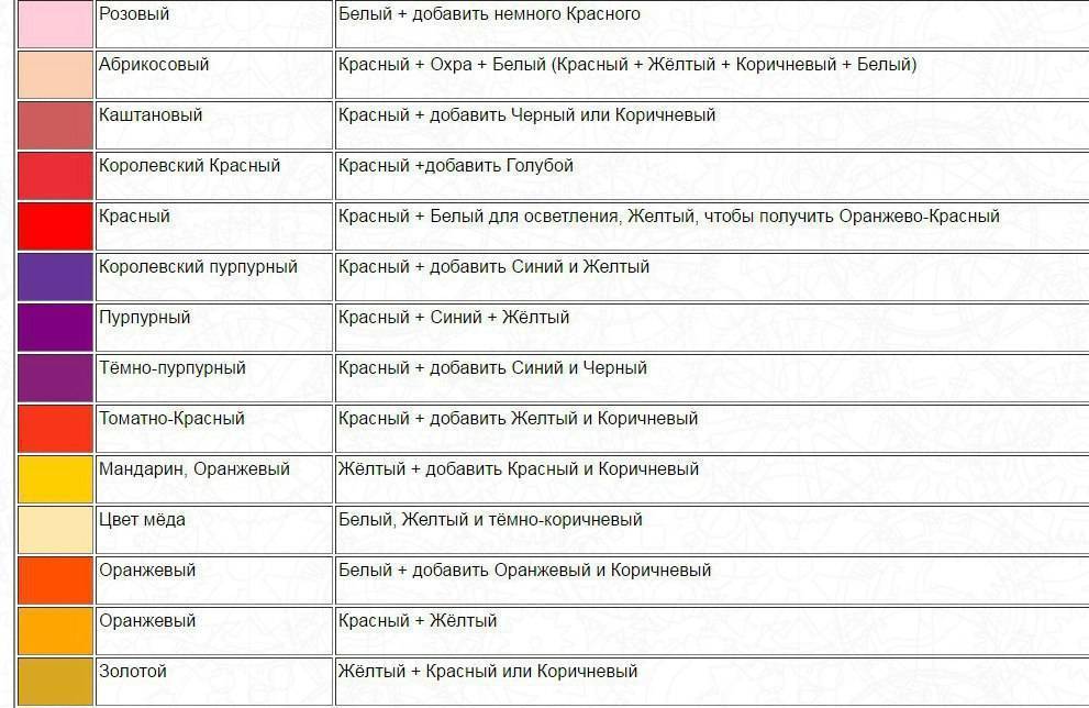 жёлтый + белый для осветления, красный или коричневый для получения тёмного оттенка |