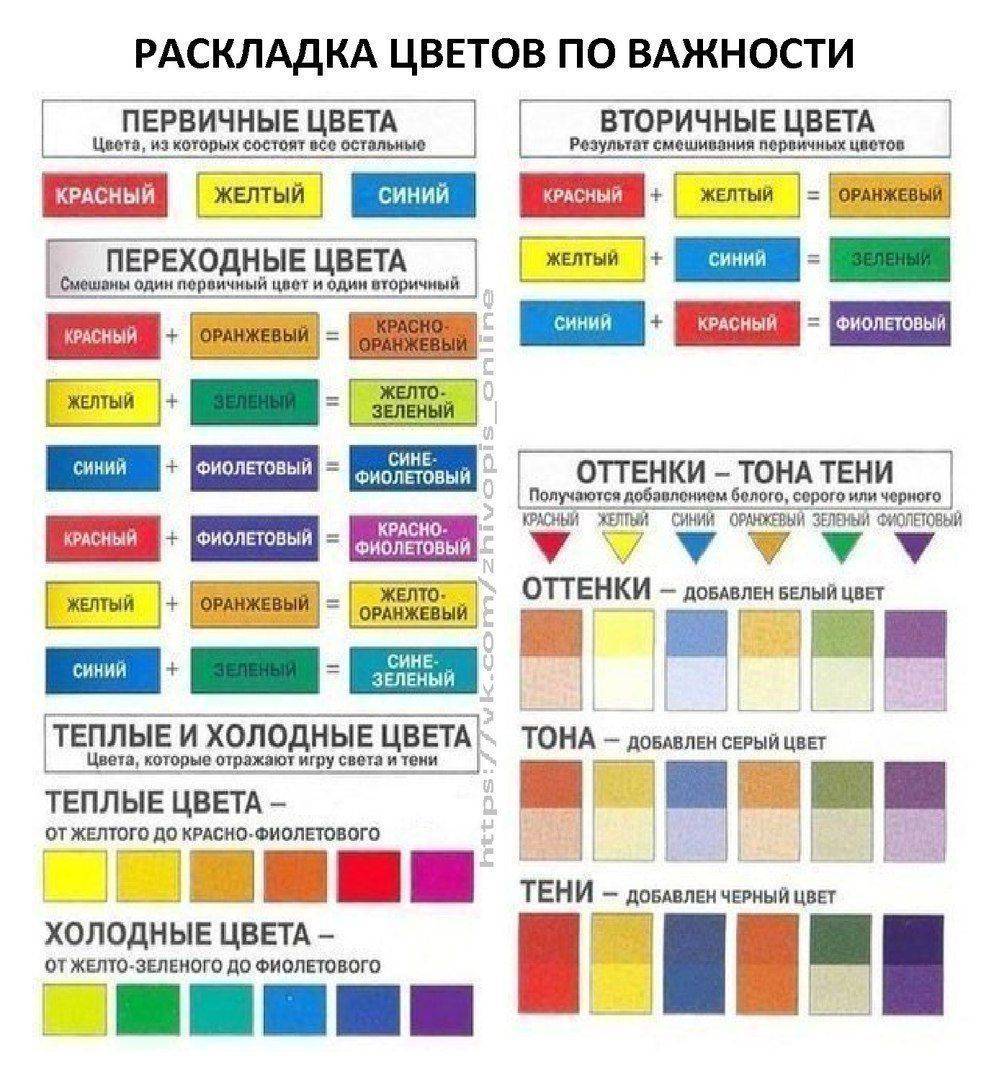 Основными цветами являются красный, синий, желтый, белый и черный. Имея эти краски в наличии, вы сможете получить практически любой оттенок.
