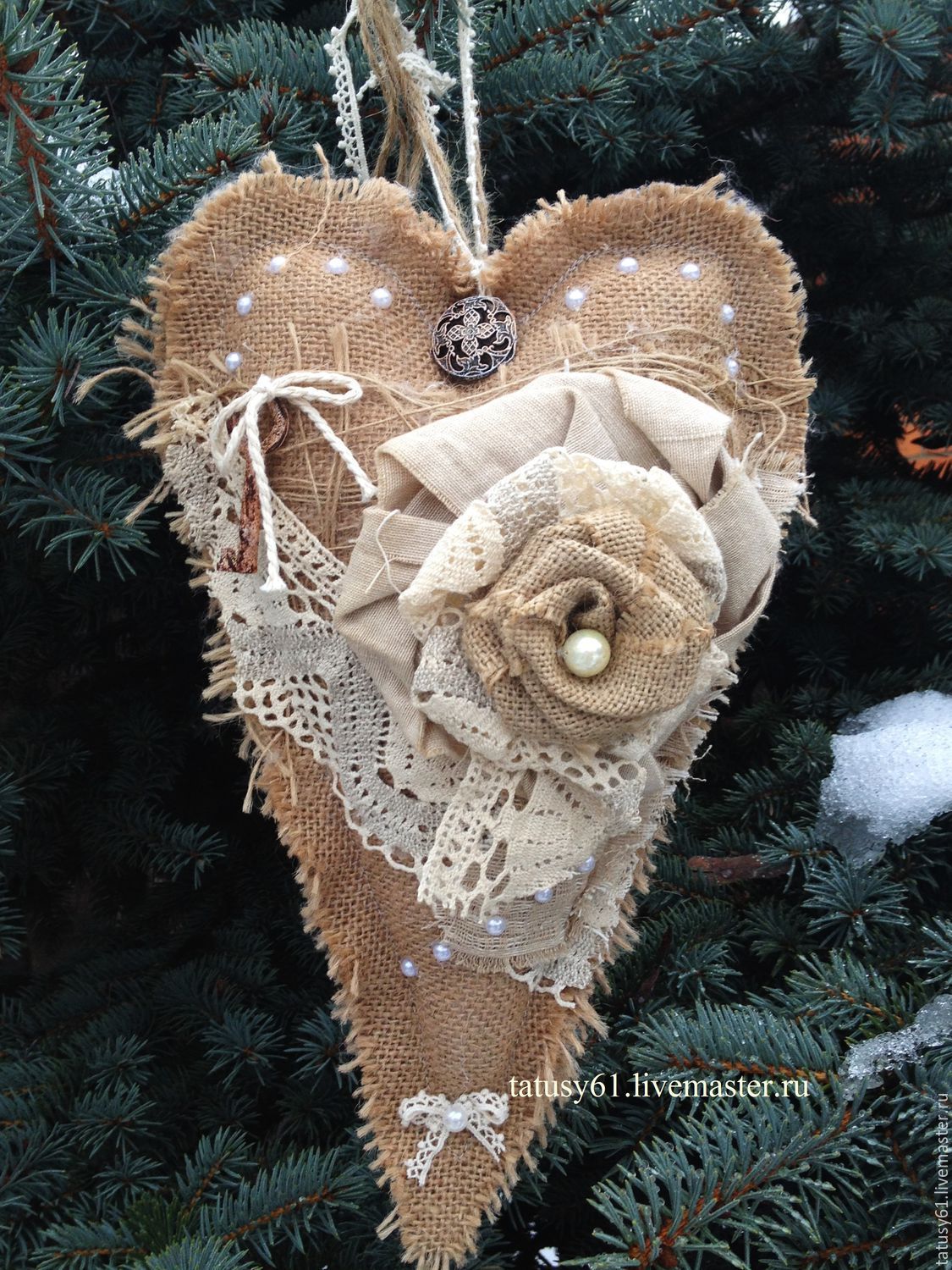 Затем сшиваем обе половинки и через оставленное отверстие набиваем игрушку синтепоном (паралоном). Далее украшаем каждую сторону игрушки, в качестве украшения подойдут: бисер, бусинки, пуговицы, ленты, снежинки и веточки ели. Получается объемная новогодняя поделка. Таким способом выполнить, возможно любую игрушку. Предлагаем так же прочитать про елочные игрушки и новогодние украшения из фетра своими руками. Елочная игрушка из мешковины своими рукамиТакже из столь обычного и невзрачного на первый взгляд материала можно сделать: