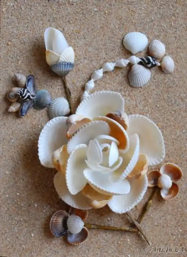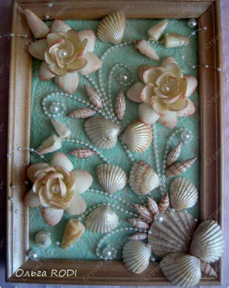 Ракушки расположены таким образом, что образуют бутоны трех цветов разных сортов и несколько насекомых: улиток и бабочку. Тонкие посеребренные веточки образуют стебли, а листки вырезаны из бумаги. В качестве сердцевины одного из цветков используется обычная персиковая косточка. Тельца улиток выполнены из пластилина, а усики бабочки можно получить из лозы.Красиво и довольно внушительно смотрится работа, представляющая собой изображение рыбки на фоне моря. Все элементы панно крепятся на гипс. В нижней части картины он практически скрыт под бисером и небольшими ракушками, образующими песок, а в верхней части лишь слегка тронут краской для формирования моря. Сама рыбка также сделана из ракушек и бисера. По поверхности панно «раскиданы» несколько блестящих камешков – прозрачных и синего цвета. Левый верхний угол рамки затянут сеткой, а остальные украшены крупными рапанами.