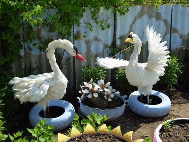 И конечно, самая популярная птица, которую часто делают из бутылок — это шикарный белоснежный лебедь. Вариантов есть несколько. Самый простой — красим бутылки в белый цвет и втыкаем горлышком в землю, формируя контур тела лебедя — заодно это будет оградка для миниатюрной клумбы, внутри которой можно посадить любые цвета.