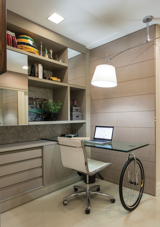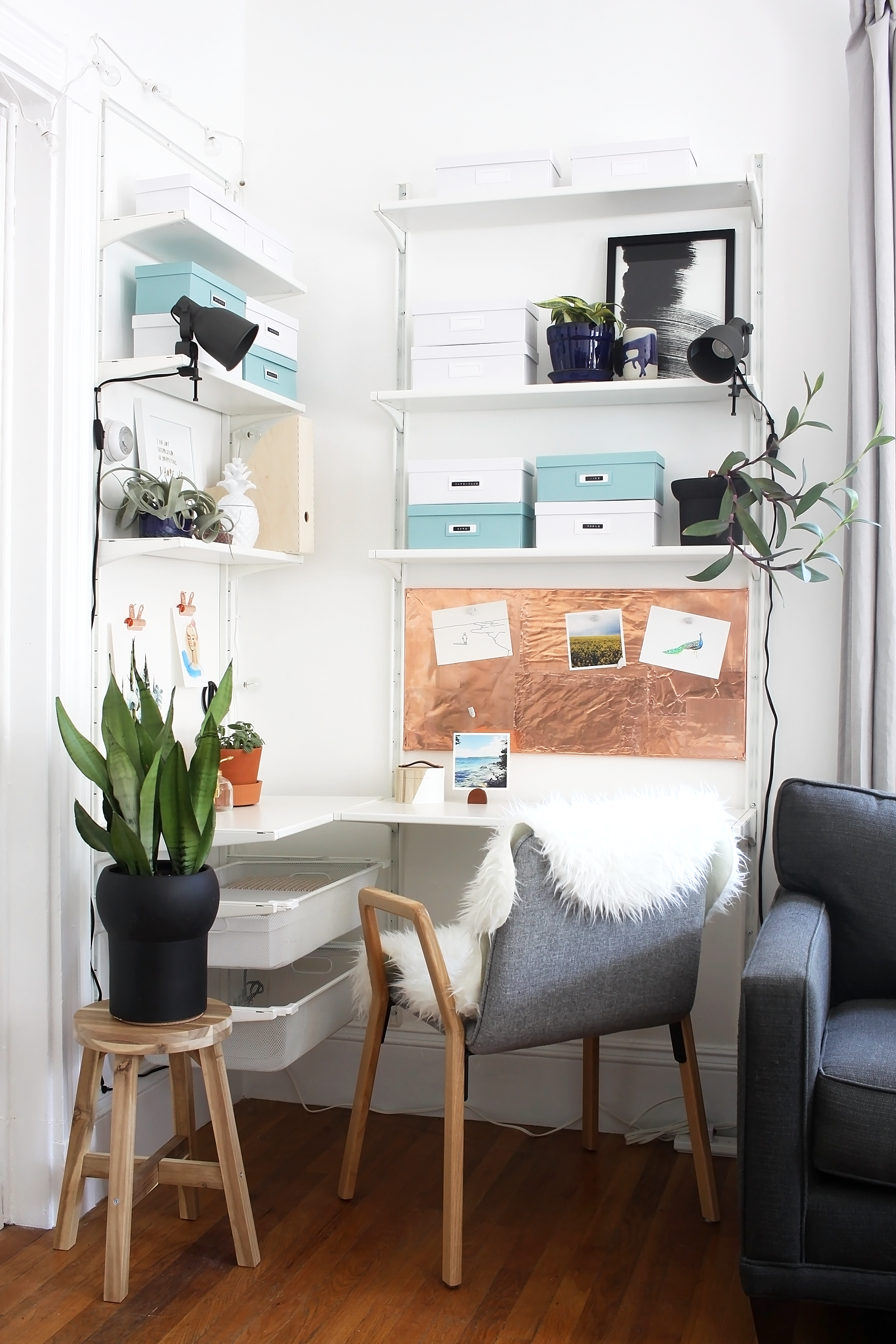 Я нашла на «Пинтересте» много фотографий рабочего места. Мне больше всего понравились белые стены и деревянные элементы, так что вопрос с дизайном решился сразу. Еще я думала о навесных полках, но поняла, что в маленьком помещении нужно больше воздуха.