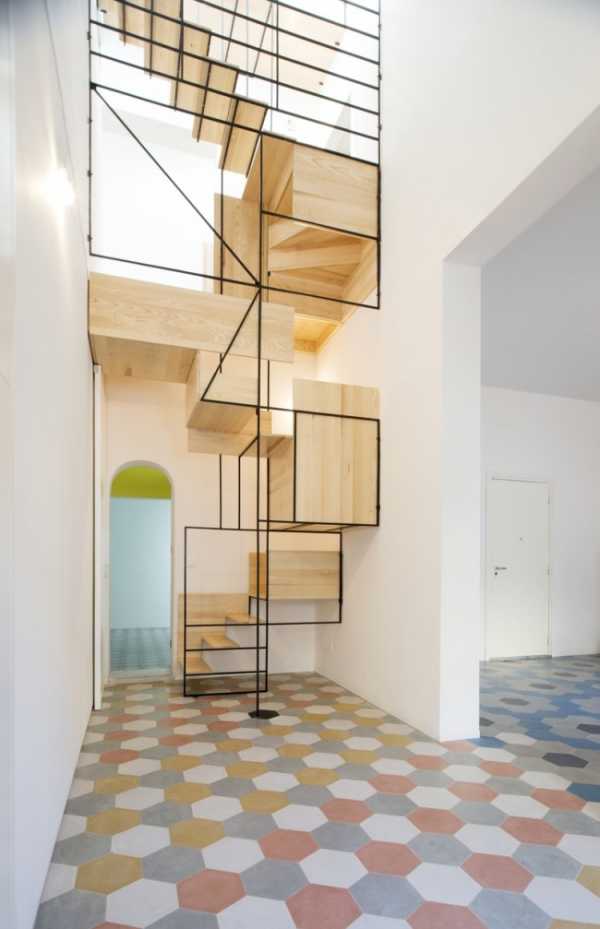 Прямые контрастные линии в просторном холле двухуровневой квартиры