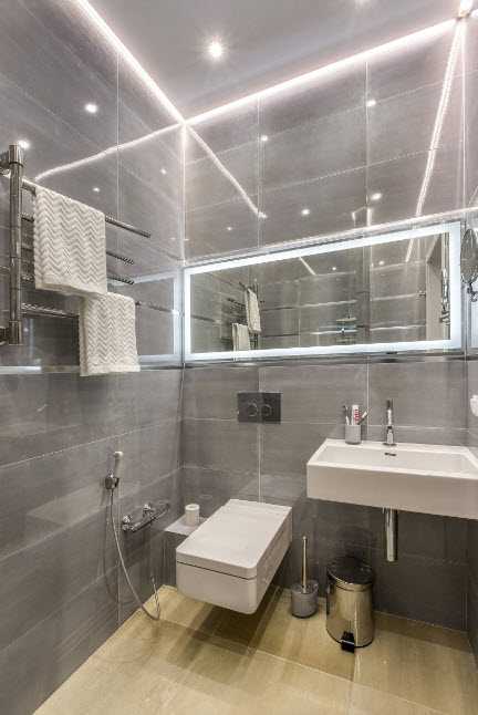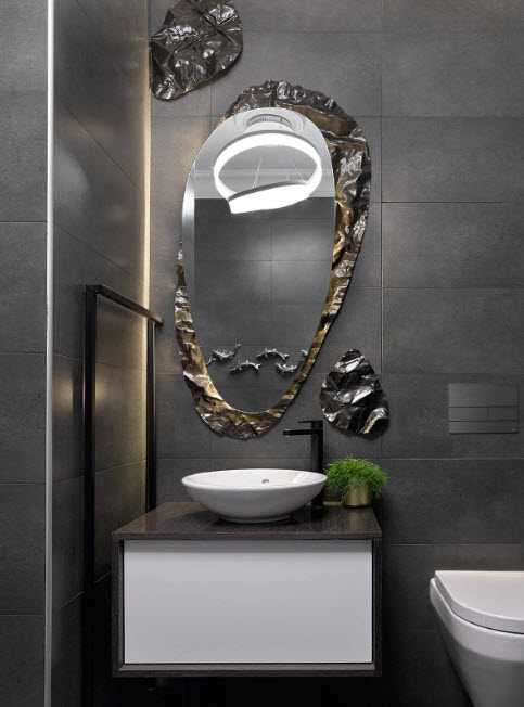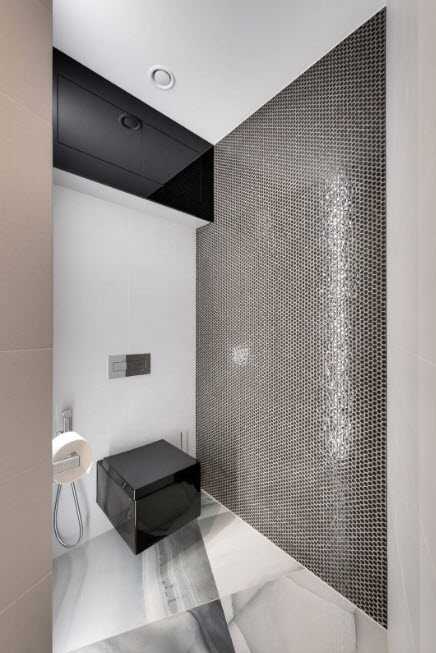 В компании с мраморным напольным покрытием и обилием зеркальных поверхностей, мозаичная плитка нейтральных прохладных тонов, создали ультрасовременный интерьер санузла. Нетривиальное исполнение раковины, зеркальный потолок, встроенная система подсветок – все работает на создание футуристичной обстановки небольшого помещения.