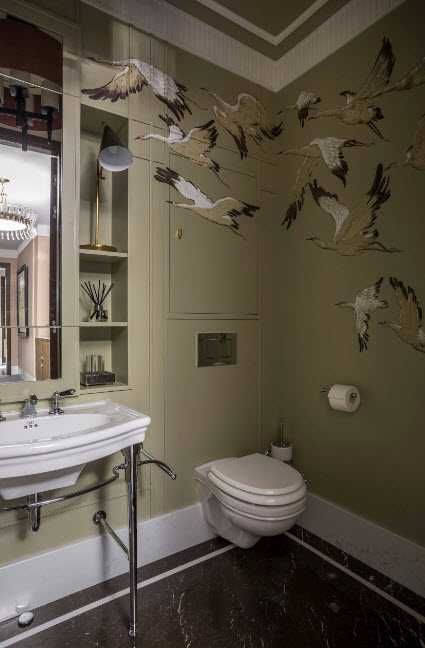 Шикарная туалетная комната в классическом стиле с малахитовой отделкой нижней части стен и позолоченным декором