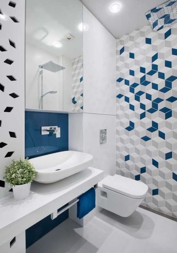 Глянцевая фактурная многогранная плитка, использованная для отделки акцентной стены, позволяет внести в помещение особый колорит, яркость и поднять общий градус в санузле.
