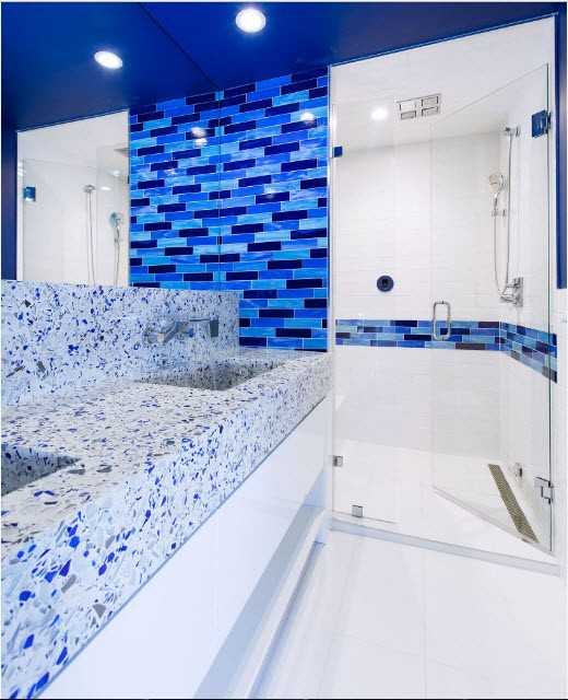 Для интерьера в ультрасовременном стиле, мозаику холодных тонов можно совместить с мраморным полом и большим количеством зеркальных поверхностей. Для создания футуристической обстановки подойдут зеркальный потолок, система встроенной подсветки и нетривиальные раковины.