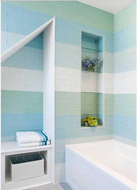 - Горизонтальные полосы. Они могут быть разной ширины: от узеньких, созданных элементами декора, и до широких, толщиной в 2 плитки. Их расположение возможно разное: на нижней трети стены, под потолком или и посередине. Их количество тоже варьируется, причем, не обязательно одного цвета.