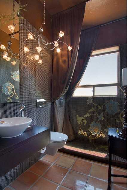 Авторы этого дизайн-проекта, похоже, взяли на вооружение девиз: «Декоров много не бывает». Конечный результат, тем не менее, радует глаз: компактный унитаз, изящные вазы в нише. Стиль выдержан на все 100%.