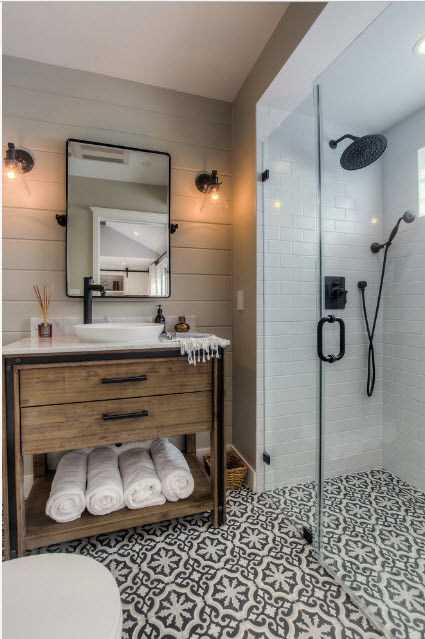 Аналогичный пример плитки, но уже цвета выбеленного дерева. Если с пространством душевой кабины, очевидно, что необходимо облицовывать все поверхности, то в зоне туалета плитку можно сэкономить, окрасив одну из стен водоэмульсионной краской или наклеив обои.