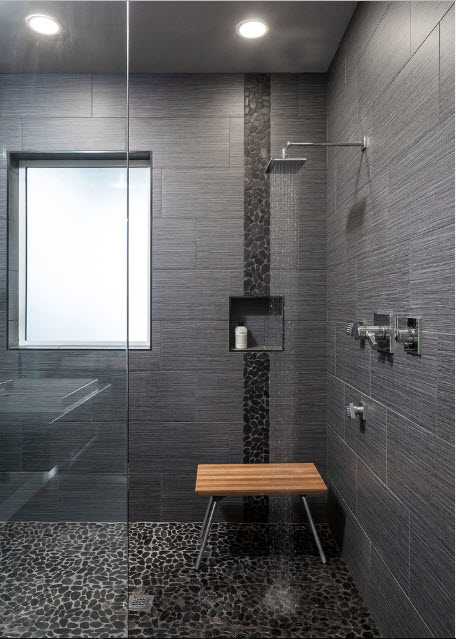 Схожий вариант облицовки всех поверхностей одним видом плитки, но уже в более темных, природных тонах. В таком помещение нужно будет уделить особое внимание освещению, иначе небольшое пространство с достаточно темной палитрой будет психологически «давить» на домочадцев.