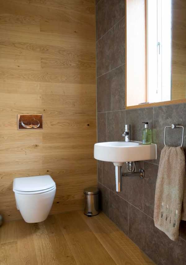 Тот редкий случай, когда дизайнер принимает решение использовать для облицовки пола деревянное покрытие, а плитку керамогранита пустить на облицовку одной из стен туалета. В результате получился строгий, не необычный дизайн утилитарного помещения.