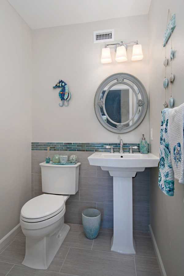 Очень часто дизайнеры при оформлении маленьких санузлов, делят стену бордюром по горизонтали. Оттенок верхней части стены при этом должен быть намного светлее нижней. Если планируется использовать декоративный бордюр, то лучше всего его размещать на уровне глаз.
