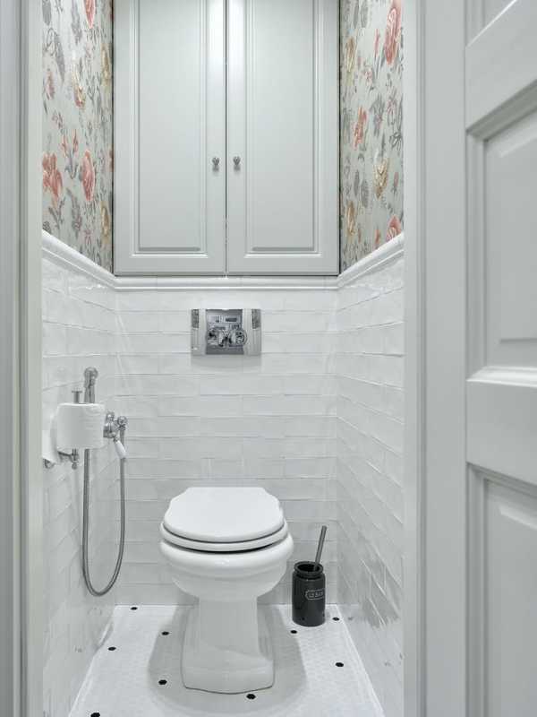 Яркий пример того, как можно грамотно использовать минимум свободного пространства. Неброские декоративные вставки с классическим цветочным орнаментом по периметру зрительно увеличивают помещение в высоту. За унитазом из плитки выложен небольшой подиум.