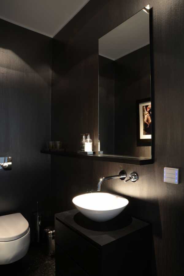 Если для отделки маленького санузла выбрана темная плитка, то нужно позаботиться о качественном освещении помещения. В противном случае, находиться здесь будет не комфортно.