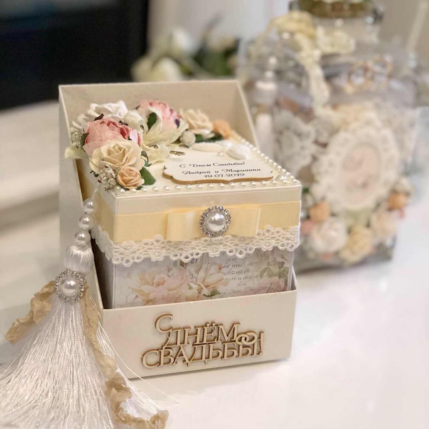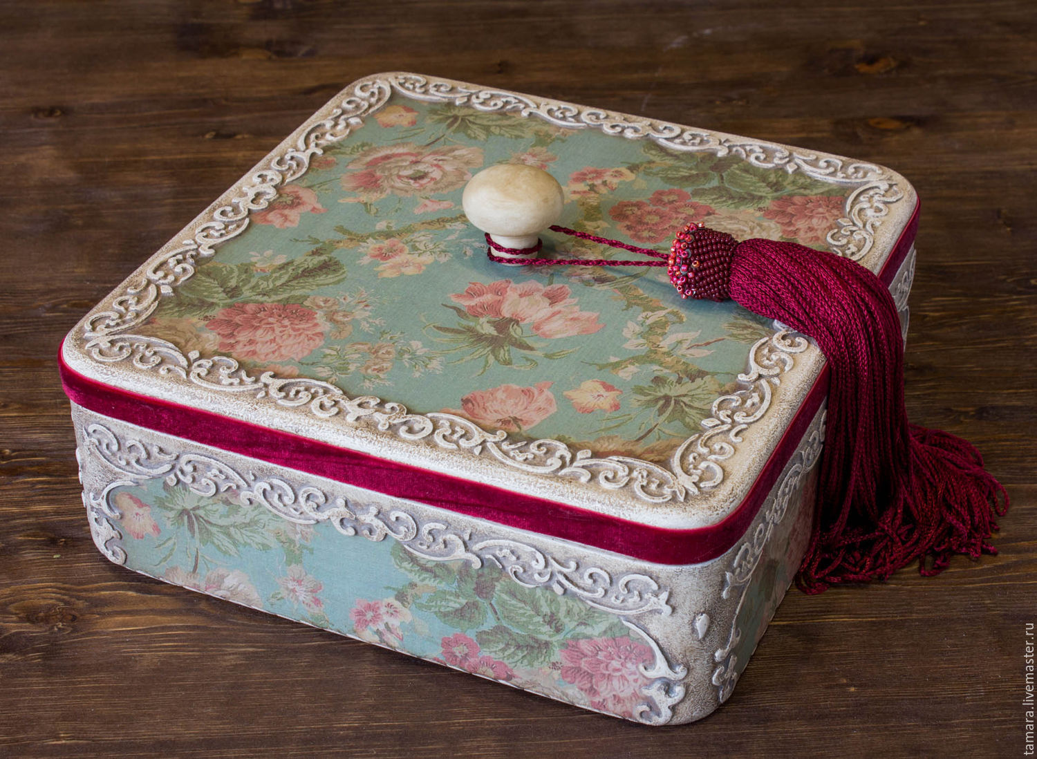 РУКОВОДСТВО — жестяная коробка с коллажем и цветами из теста