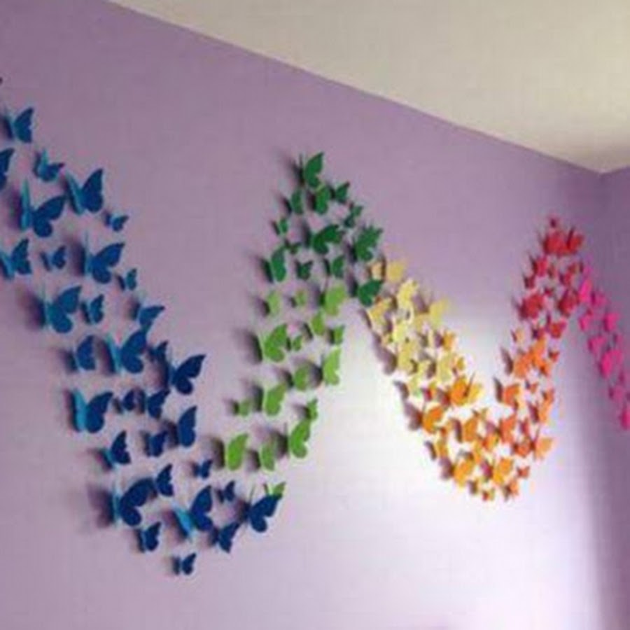 Наиболее доступный способ декорирования — оформить стену бабочками из бумаги. Сделать мотыльков однотонными или сочетать два цвета зависит исключительно от фантазии начинающего дизайнера. При отсутствии необходимых оттенков акриловая краска и белая бумага решат возникшую проблему. Интересно смотрятся бабочки на стене, сделанные из ярких листов глянцевых журналов. Многообразие оттенков сложно создать самостоятельно, а яркие печатные рисунки без дополнительных затрат причудливо украсят стену. Предварительно скомпонованная палитра позволит сделать плавные переходы в композиции.