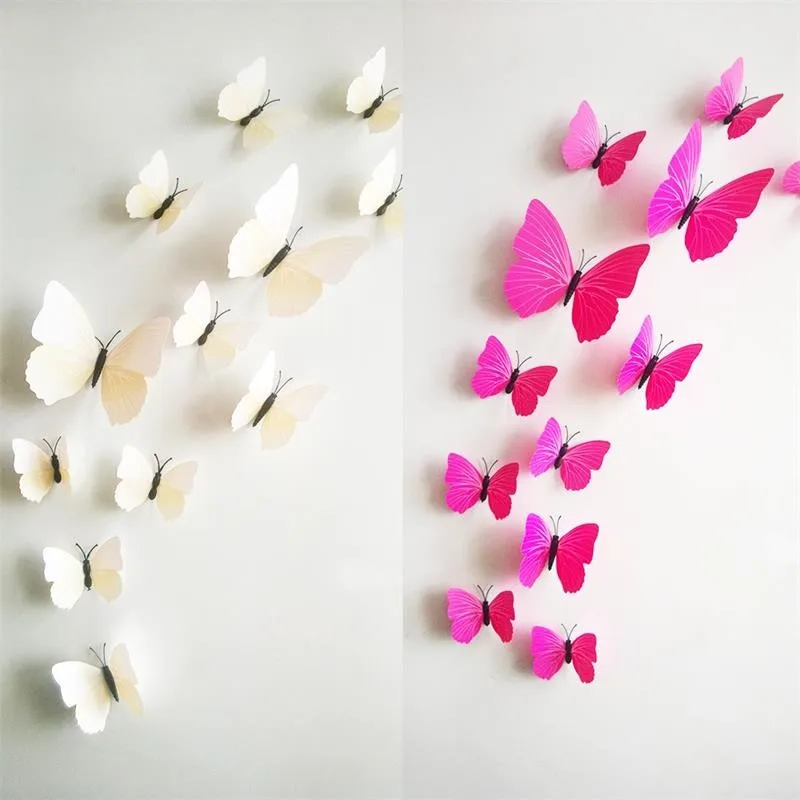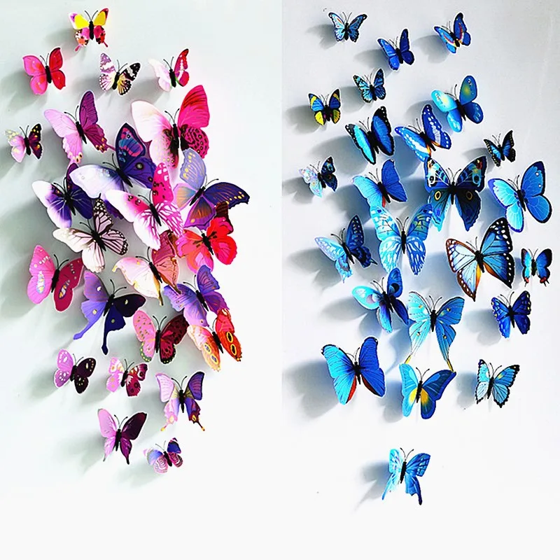 - Продумайте цвет, размеры и форму украшений. Яркие оттенки на светлой стене – оптимальное решение. Разные по величине бабочки смотрятся гораздо эффектней, чем сделанные по одному трафарету. Максимально приблизиться к натуральному изображению помогут бабочки, сделанные с асимметрией. Не стоит строго соблюдать зеркальность, в конечном итоге небольшие отклонения придадут объема и динамичности виду аппликации.