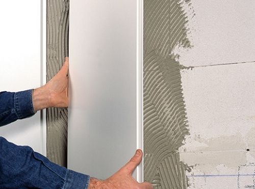 Теперь сама панель. Она подрезается в соответствии с высотой помещения, тыльная её сторона очищается от пыли влажной тряпкой. Только после этого можно наносить на неё клей. В зависимости от кривизны стен, клей может наноситься несколькими способами. Если стены можно назвать идеальными, то нанесение клеевого состава выполняется полосами по периметру и середине полосы, а вот если стены имеют искривления, то клей лучше наносить точечно, большими каплями. Такой подход к делу даст гарантию того, что даже во впадинах панель качественно приклеится к поверхности стены.