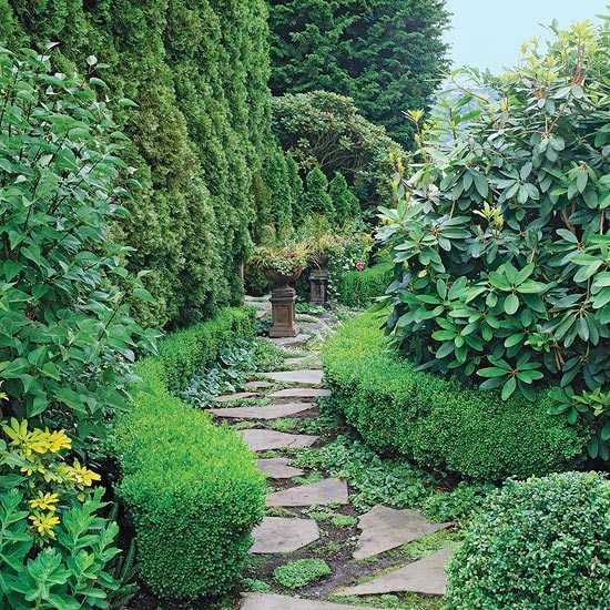 Наиболее часто вечнозеленые растения используют для экранирования от любопытных глаз. Высокие, столбчатые разновидности западной туи, тиса и можжевельника отлично подходят для небольших пространств.