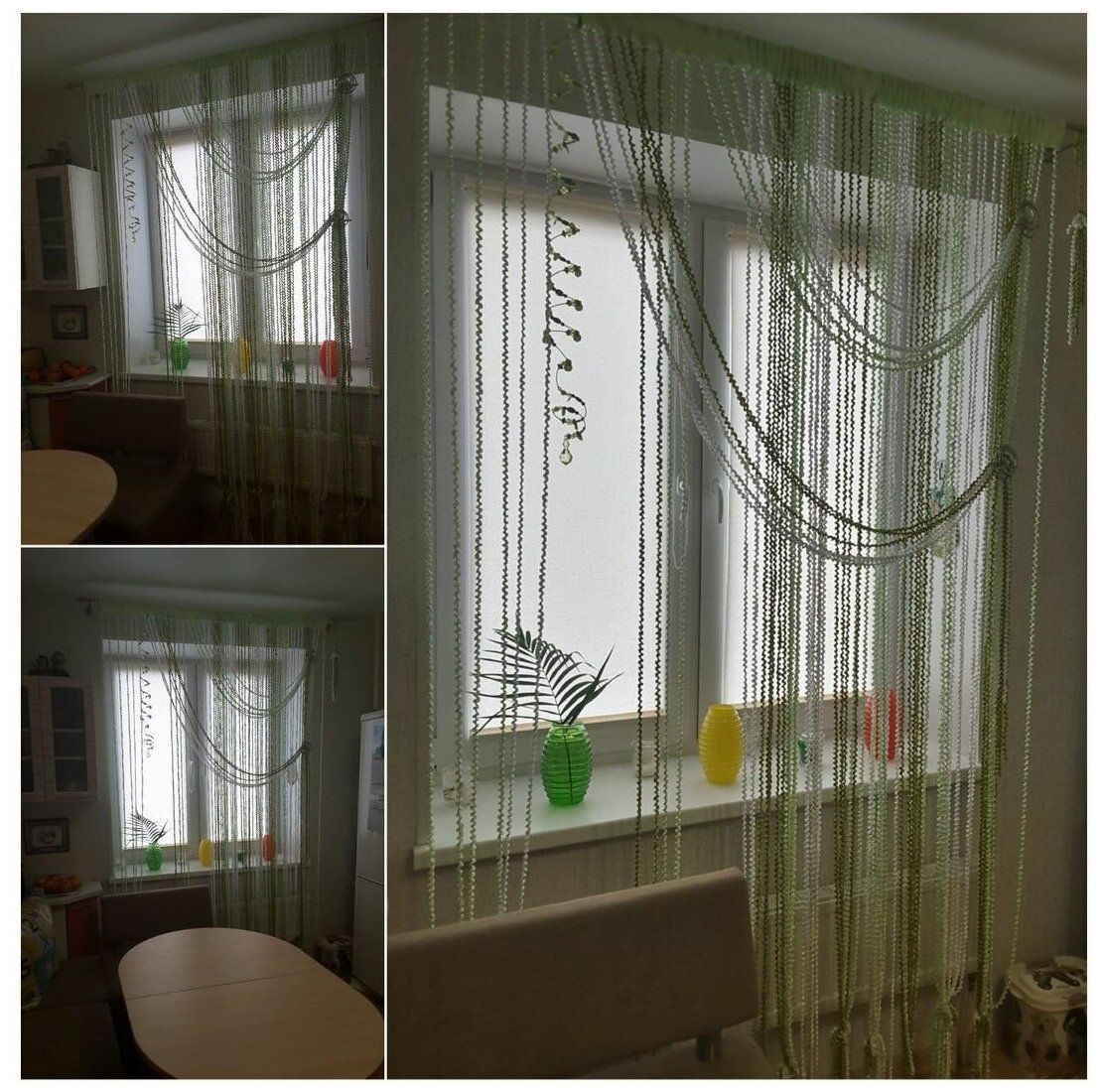 Как красиво повесить и задрапировать нитяные шторы на кухне.