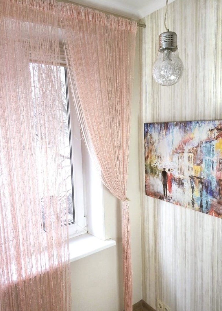 - Основывайтесь при выборе нитяных штор на тех материалах, которые не подвержены выгоранию, если вешать будете у окна.