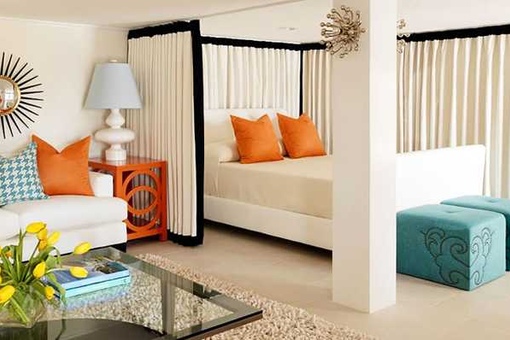 Шторы также являются популярным способом разделения пространства в одной комнате, но они также обычно создают непринужденный вид.Они могут быть хорошим вариантом для семейных номеров в пляжном стиле или для современных домов.