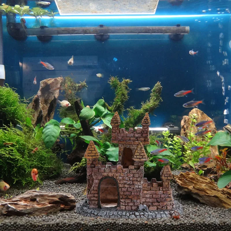 Искусственный камень может стать неплохим вариантом. Из него производят замки, барьерные рифы, домики для рыб. Это безопасный вариант и может быть использован во время создания дизайна наряду с натуральным вариантом.