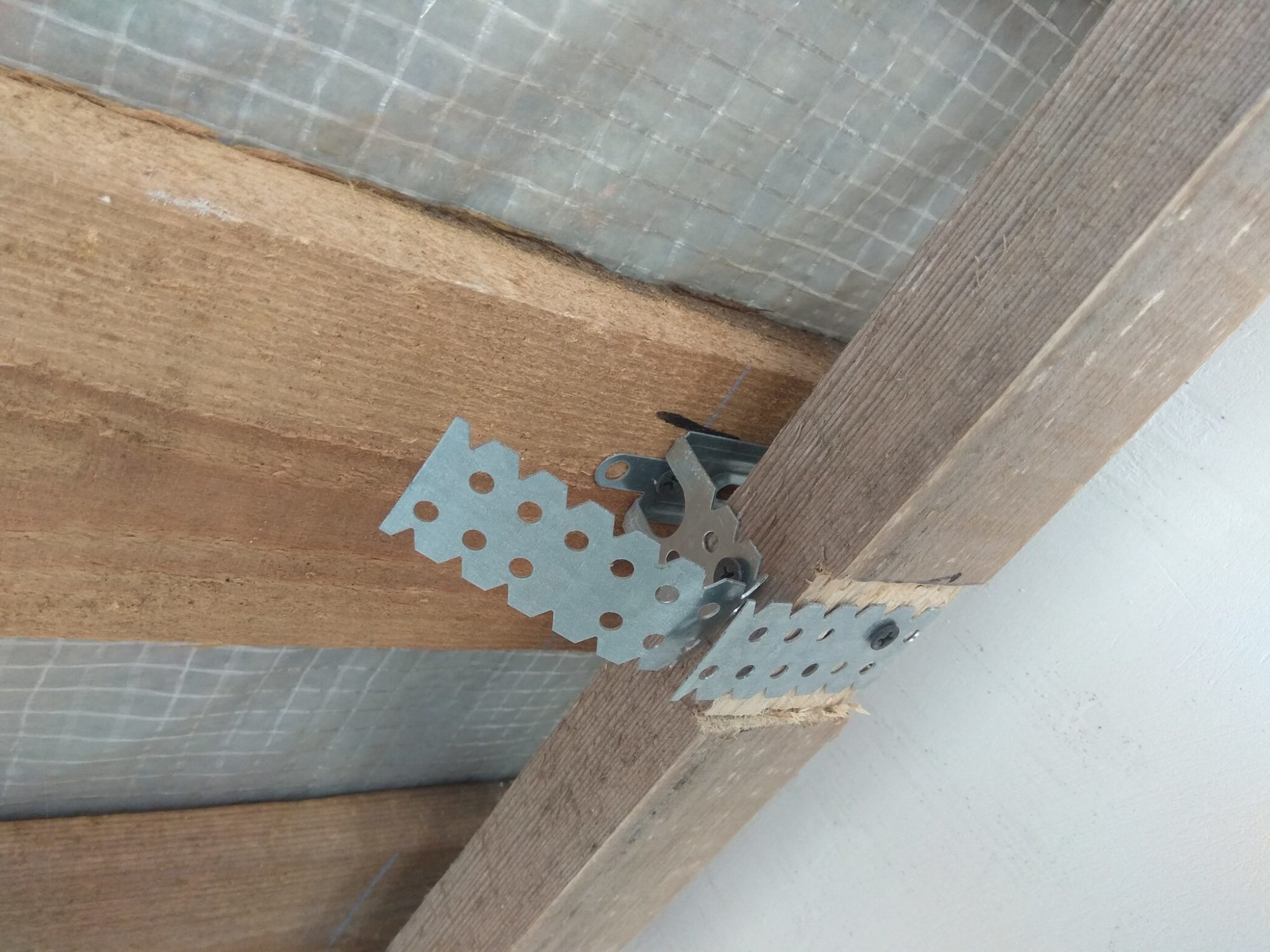 - Состыкуйте верхнюю ламель с нижней, наклонив первую под углом примерно в 45 градусов. Прижмите её к рейкам и также закрепите кляймерами.