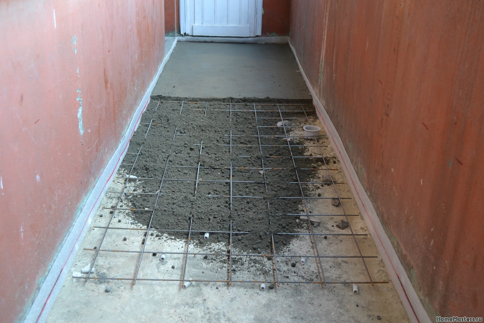 - Начальный этап установки балконного пола заключается в заливке стяжки. Чтобы стяжка была ровной, в первую очередь нужно решить проблему выравнивания пола. Делается это при помощи установки маяков, представляющих собой укреплённые полосы из металла. Данные полосы разрезаются на некоторое количество частей (зависит от величины балкона) и устанавливаются на расстоянии 60 см друг от друга, перпендикулярно основанию.