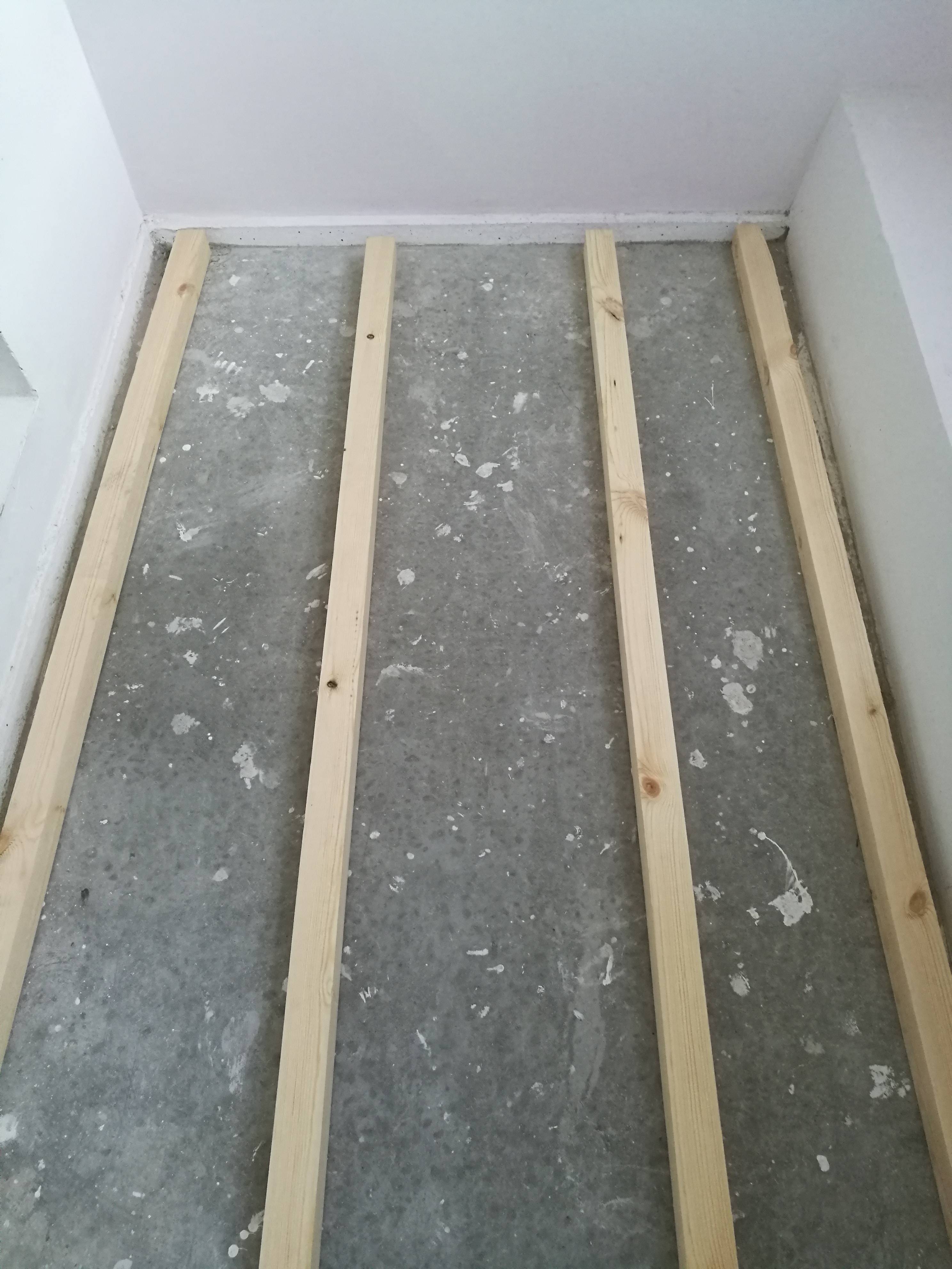 - Деревянные планки будут теперь крепиться уже не к полу, а к деревянным планкам первого слоя.