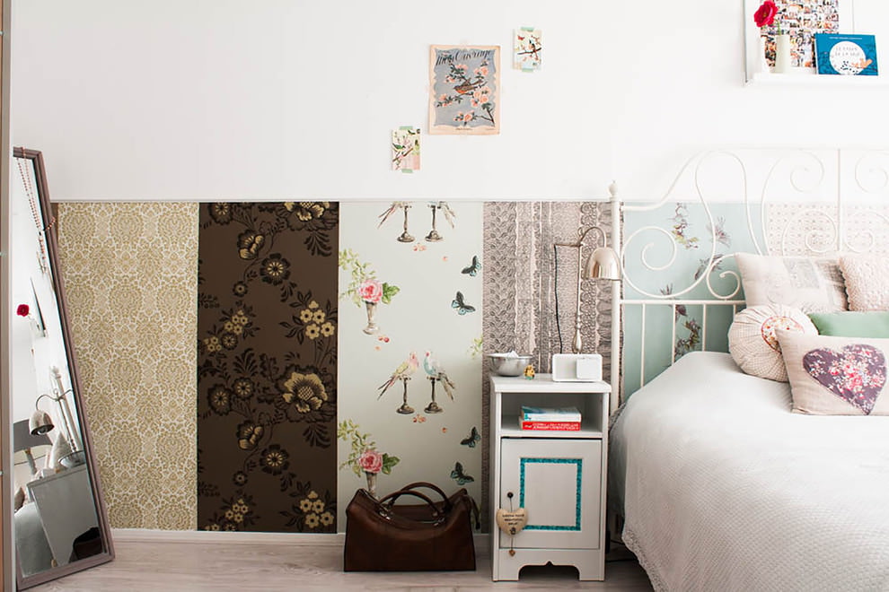 Лоскутный способ позволяет создавать сочные акценты или добиваться плавных переходов между частями композиции. Здесь должны использоваться обои, одинаковые по толщине, и поскольку стыков между фрагментами очень много, лучше применять бумажные.