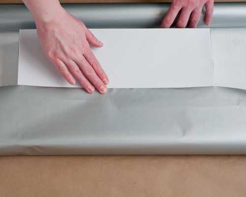 В первую очередь необходимо развернуть материал, который будет использоваться для обклеивания. Далее поместить коробку таким способом, чтобы бумага покрыла все ее стороны, включая боковые.