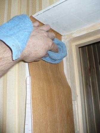 10. Дверную коробку так же грунтуем, и приступаем к ее оклейке.