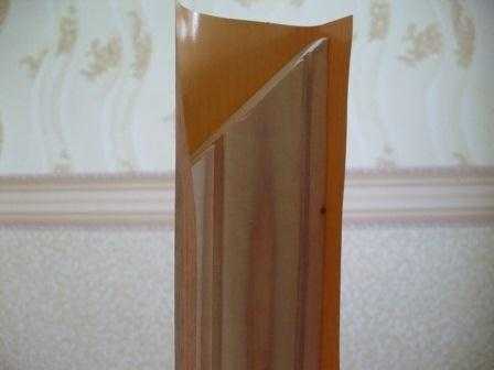 7. После нарезаем полоски из самоклеющейся пленки шириной, соответствующей ширине откосов с плюсом в 2см, и аккуратно снимая бумажную основу с пленки, прикладываем ее клеящейся частью к откосам.