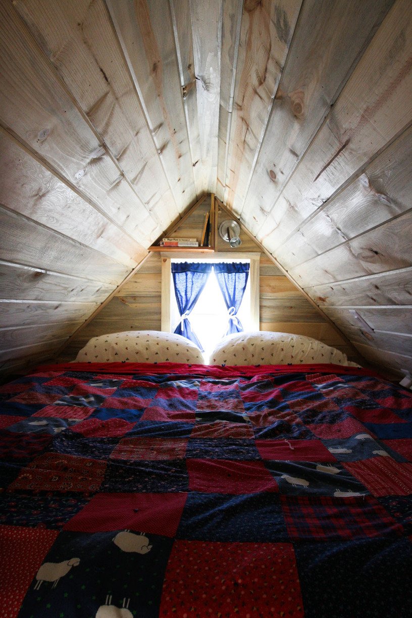 Организовать небольшую, но уютную спальню можно в светлых тонах. Стены и потолок обшиты вагонкой, есть окно как в крыше, так и на стандартном месте.