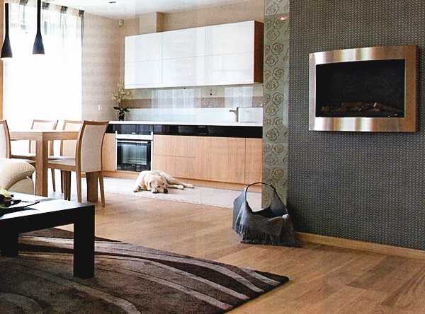 В качестве покрытия для пола используется линолеум, паркет либо ламинат. Пол должен делаться из материала одного цвета, фактуры. Если дизайнерское решение позволяет, пол квартиры устилают ковровым покрытием. Напольные материалы можно использовать для зонирования пространства. Для этого случая неплохо сочетаются ламинат и керамическая плитка, ковролин и натуральное дерево. Но в этом случае стоит помнить, что использование разных материалов для оформления пола скрадывает пространство, а одинаковое напольное покрытие визуально увеличивает площадь.