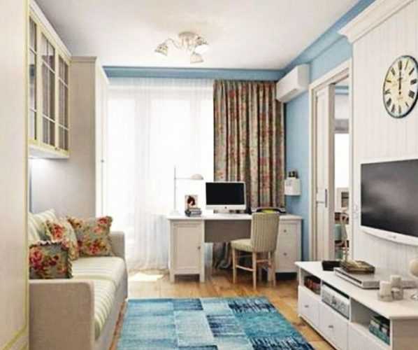 Синий и белый цвет в дизайне гостиной в хрущевке. Фото 9