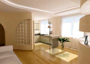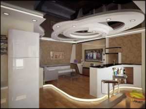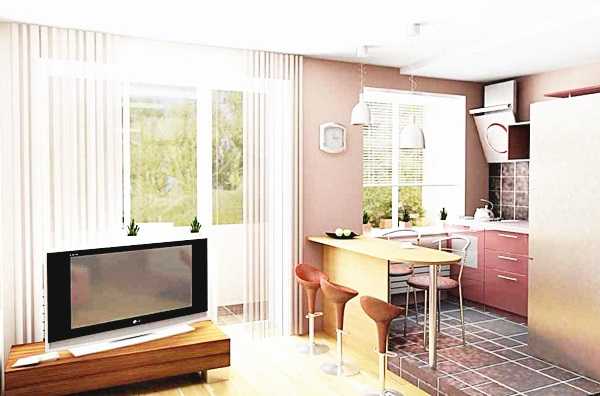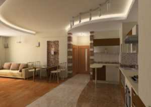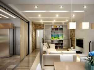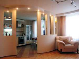Убрав стену между комнатой и кухней, можно освободить немало пространства, разделить его на равные зоны и визуально расширить при помощи световых эффектов на потолке и стенах, а также особой окраски потолка и пола. Интерьер кухни может быть подобран любой, выбрать самый удачный помогут фото на дизайнерских сайтах.