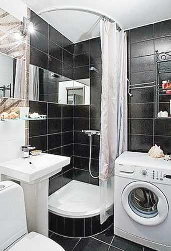 Хорошим решением может стать установка компактной душевой кабины вместо ванной. Освободившееся пространство занять под узкую стиральную машину, а в углу повесить шкаф-пенал.