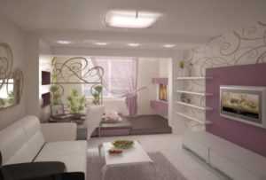 - гостиная — в центре гостиной рекомендуется поставить журнальный стол, несколько небольших кресел. На стену напротив можно повесить телевизор, оборудовав его приспособлениями для поворота в различные стороны. При этом его будет удобно смотреть не только сидя в кухне, но и удобно устроившись на диване. Гостиная в обязательном порядке включается в дизайнерский проект, для нее достаточно 6-7 кв м;