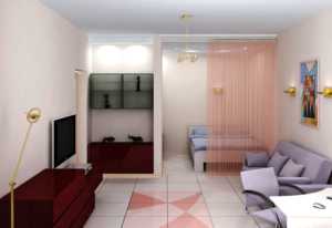 Зону для ночного сна и отдыха можно окрасить в желтый либо розовый цвет, поставить в это место мягкий диван и шкаф. Зону, которая будет выполнять функции гостиной, рекомендуется оклеить более темными либо, наоборот, более светлыми обоями другой фактуры, но такого же оттенка. Кухню лучше оклеивать моющимися обоями в полоску.