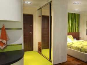 Декоративные ниши со сквозными полками у входа делают пространство легким. Гостиная в однокомнатной хрущевке кажется больше за счет использования встроенного шкафа с зеркальной поверхностью, украшенной рисунком.