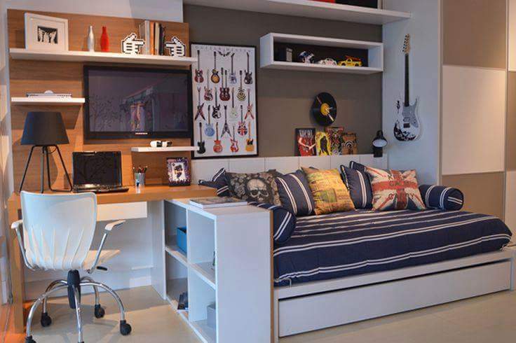 В спальне мальчика-подростка должно быть достаточно просторно – лишних предметов, избыточного декора, лучше избегать. Обычно каждый ребенок имеет хобби, которое важно учитывать при оформлении помещения.