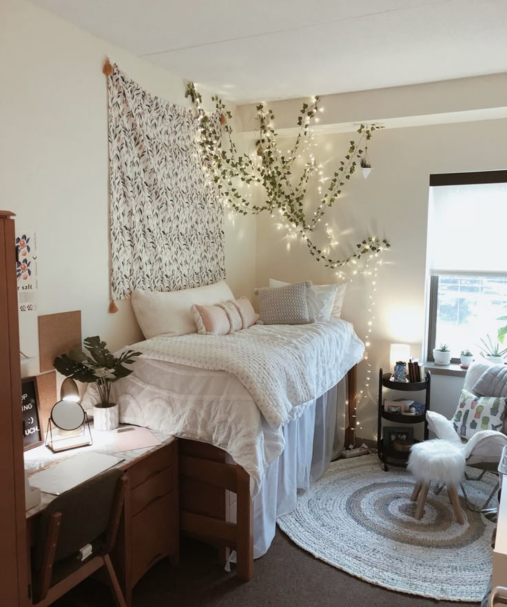 д., все должно быть в хорошем состоянии, чистым и сочетаемым друг с другом - Современный тренд – украшение пространства растениями. Живые цветы могут привнести свежести и интереса в дизайн. Кроме того, они полезны, делают воздух чище и благоприятно воздействуют на мозговую деятельность, что очень важно для студента. Узнать больше о комнатных цветах вы можете из статьи «Как создать Urban jungle».