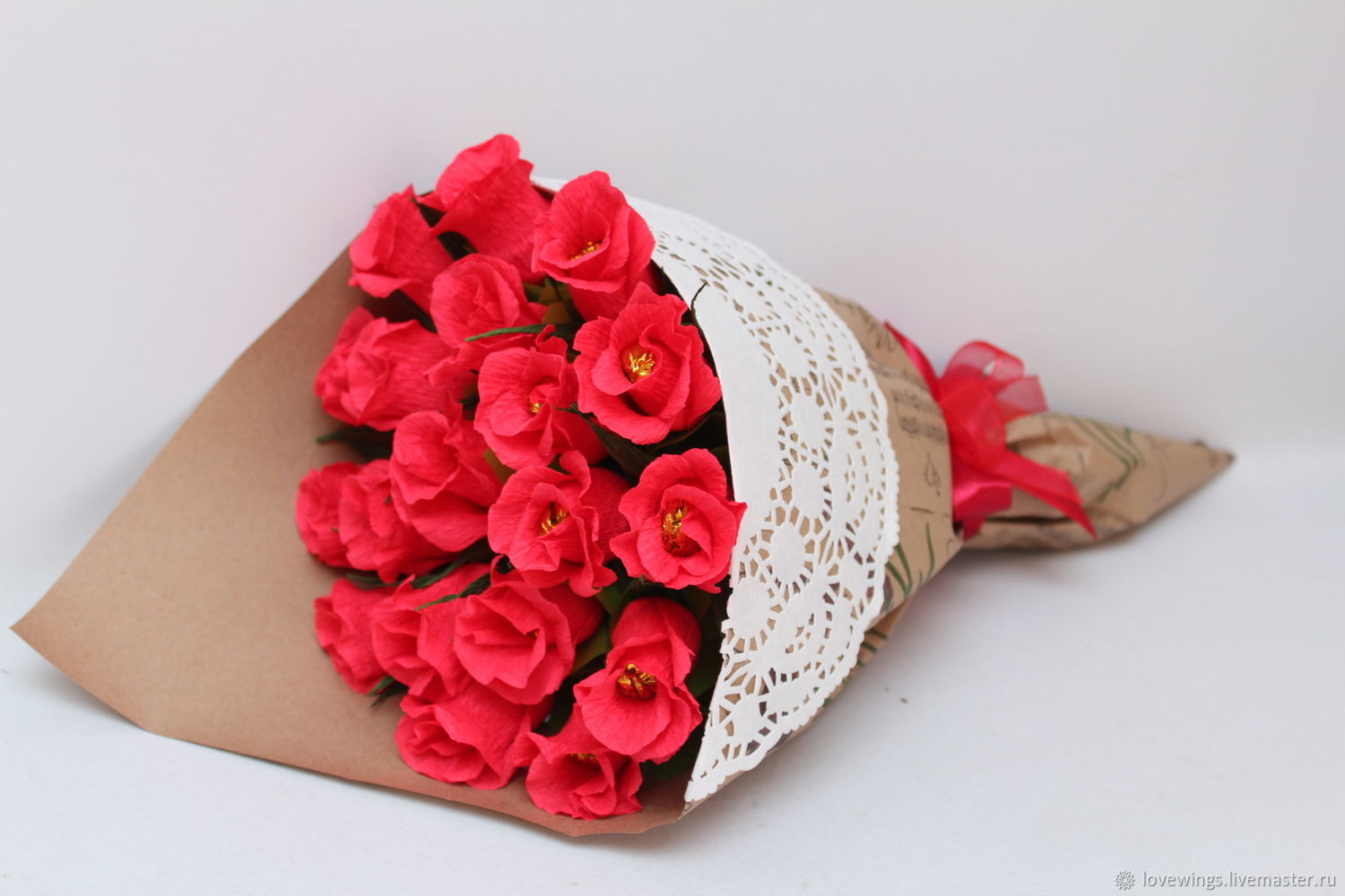 Все готово, осталось лишь вручить букет получателю и порадовать близкого вам человека. Не волнуйтесь, если результаты вашего труда не будут выглядеть идеально как букеты в цветочных мастерских. Главное в самодельном подарке то, что вы вложили в него свою любовь.
