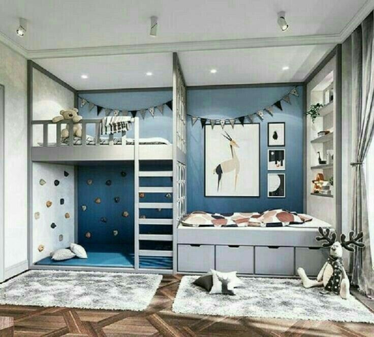 Эта спальня придерживается сине-серой палитры с оттенками черного, оконными шторами с принтом под зебру и двухъярусными кроватями из состаренного дерева.36 из 39