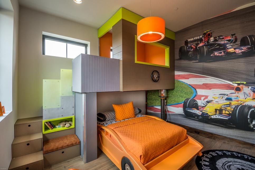 В этом классном уголке для чтения в спальне для мальчиков от Sissy + Marley Interior Design есть иллюстрированные обои с изображением грузовика, кресло для чтения в форме лебедя, большие лего и настенные стеллажи с любимыми книгами.