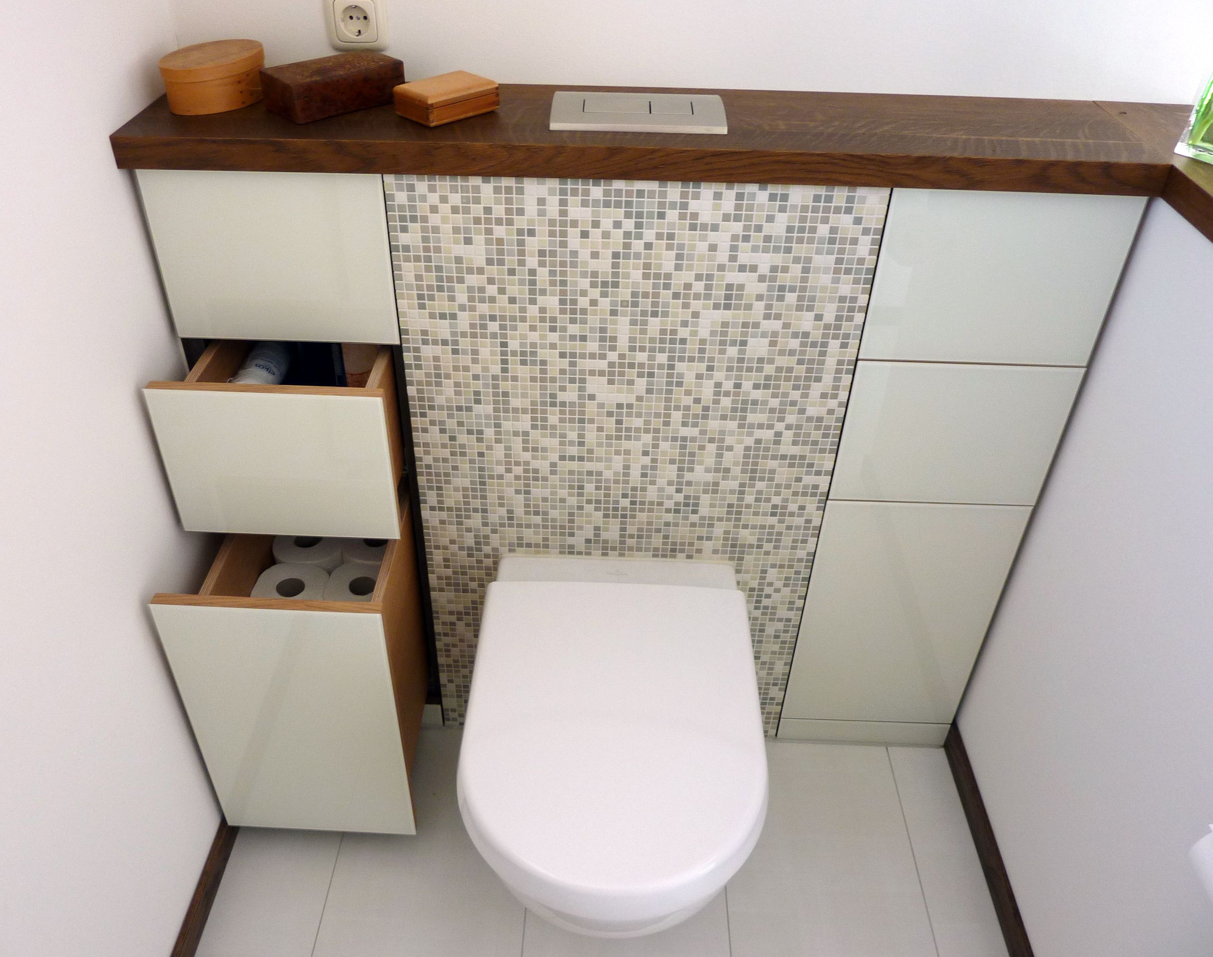 - Рассмотреть возможность использования скрытой за отделкой мебели (шкафов или ниши). Значительно сэкономить пространство помогут также угловые полки, узкие шкафы, тумбы, совмещенные с раковиной. Там можно спрятать туалетную бумагу, освежители и другие принадлежности.
